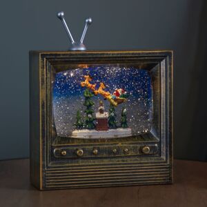 Celebrate the nostalgic charm of Christmas with this 22cm Light up Christmas TV Water Spinner with Santa in his Sleigh Scene. A beautifully detailed festive decoration that brings the magic of the season to life. Crafted in the style of a vintage television set, this eye catching piece showcases a delightful scene of Santa in his sleigh flying over a snowy village, perfectly capturing the wonder of Christmas Eve. Softly illuminated by warm white LED lights, casting a gentle, cosy glow that highlights every detail. Meanwhile, silver glitter swirls continuously around the scene, mimicking a flurry of falling snow and adding a mesmerising, snow globe style effect. Finished in an elegant antique gold colour, the decorative TV casing gives a classic, timeless look that blends beautifully with both traditional and modern decor. Battery operated for ease and flexibility, the unit requires 3 x AA batteries (not included). Suitable for indoor use only. Product Specifications Warm White LEDs