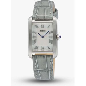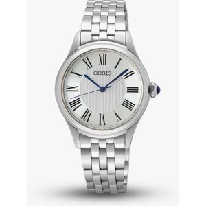 Embrace classic style with this stunning Seiko ladies Caprice watch, featuring a sleek stainless steel case and bracelet for a polished, versatile look. The crisp white dial is accented by bold black Roman numerals and elegant blue hands, with a blue crown adding a refined finishing touch. A perfect blend of tradition and sophistication, made to elevate any outfit. • Powered by the quartz movement. • Presented on a silver stainless steel bracelet with push button deployment clasp. • Hardlex glass. • 29.6mm case width. • 50 metre water resistance.