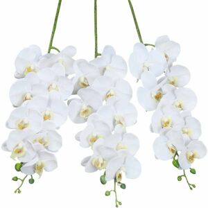 Set of 3, each orchid stem is 36" tall, including 9 big blooms, among which 5 blooms are 4.13", 4 blooms are 3.54" in diameter. Dark green spotted stem. Flowering Portion is 15.7" Long. PU real touch soft petals, fresh color, long stems,odorless. Note: We bend the long stem for easier packaging. You can easily straighten it. The flower might be squashed, out of shape during transit. Please dip the flower in hot water, the flower petals will be restored. Bendable long stems, black spotted dark green stem that has iron inside, you can bend the stem to the shape you like, adjust the flower and make a nice arrangement. Realistic Looking Artificial Orchid Stems, fresh and natural looking,like real orchid flower stem picks,suitable for four seasons, even in winter and autumn, necessary flower bouquets for decoration and arrangements. Easy to Care Fake flower branches are easy to care, no trimmed or watering, keeping fresh for long time Bendable long stems, iron wrapped by soft plastic, you