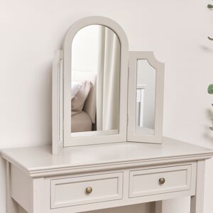 This Grey Arched Triple Dressing Table Mirror from the Daventry Taupe-Grey Range is a simple yet beautiful vanity mirror that will look lovely placed on top of a dressing table bathroom unit or vanity space. Made of wood and glass this mirror has an arched triple mirror design and comes with a warm Taupe-Grey painted finish. This versatile mirror could easily blend into modern vintage or farmhouse style interior spaces. Browse the full furniture collection for all matching items including bedside tables chests of drawers dressing table sets sideboards and more. This item is also available in White and as part of a dressing table set. Part of a large collection of mirrors available in a wide variety of colours sizes and designs. Would you like to view more items like this one? Browse our full Daventry Taupe-Grey Range for more options. Colour: Taupe Grey Taupe-Grey Finish: Painted Material(s): Wood Glass 70cm x 61cm x 2cm (width x height x depth) Fully assembled