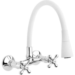 The INVENA ROMA wall faucet is a functional solution for people looking for faucets with an interesting design that match the kitchen with traditional water installation. The faucet is equipped with a flexible spout, which facilitates washing large-size dishes and also a great help for children. The combination of solorful spout and chrome will match most kitchen arrangements. It fits perfectly with both high-gloss furniture and wood. The two-handle faucet is perfect for retro and boho styles. Can also be used as bathroom basin tap, Specifications: - Type: kitchen/bathroom wallmounted tap with flexible spout; - Material: brass and silicone; - Two types of jet: normal or spray; - Finishing colours: chrome (body) and white (spout); - Quarter turn cross heads; - Water savig aerator.