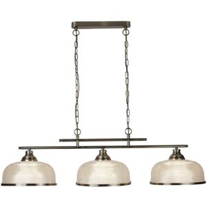This Searchlight Bistro II three light bar ceiling light is finished in antique brass and comes complete with glass shades. This stunning light is suspended on chains and the ribbed acid glass shades make this a striking light. It would look equally incredible in a cafe or bar, or indeed over a kitchen worktop or island. Product code: 3593-3AB FEATURES: * Finished in antique brass * Matching items available and also finished in satin silver (please see website) * Class 1 earthed SIZE: * Drop - 800mm * Height - 270mm * Width - 270mm * Length - 990mm BULBS: * Takes 3 x E27 LED Bulbs - Not included