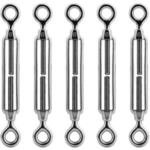 Type: The turnbuckle with hole and hook allows you to tighten a taut rope and regulate the elastic effect. Material: The turnbuckle hooks are made of 304 stainless steel for greater strength, durability, waterproof, rust and corrosion resistance. Use: Suitable for tensioning the rope and regulating the elastic effect; Perfect for steel wire, antennas, clotheslines, chains and other ropes. Use: Perfect for indoor and outdoor use. Easy to use: A simple twist to increase/reduce tension. Package Included: 5 x M6 Hook Cable Tensioners.
