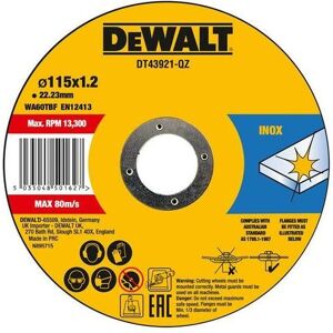The DEWALT DT43921 Metal Cut Off Disc is manufactured from professional aluminium oxide grain, designed for cordless tools to maximise life and performance. Ideal for use in general cutting work on stainless steel, ferrous metals and non-ferrous metals. With an extra thin kerf (1.2mm) for the perfect cut. Pack of 10 discs supplied in a storage tin. Specification: Diameter: 115mm Thickness: 1.2mm Bore Size: 22.23mm