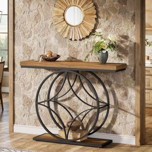 • Farmhouse Industrial Charm: Blending rustic warmth with urban edge, this console table features a circular metal base and geometric frame that adds stylish stability to any space. It easily blends into a variety of decor styles, from modern to farmhouse. • 2-Tier Storage Shelf: Two spacious open shelves provide the ideal display space for books, decor and essentials. Perfect for displaying cherished decor or organizing everyday items, this entry table beautifully blends practicality with design appeal. • Heavy-Duty Construction: Built with a thickened 1.57" E1 particleboard top and a sturdy metal frame supporting 100 lb, this accent table features adjustable foot pads and anti-tip safety for reliable, wobble-free performance in busy households. • Versatile Placement Options: Perfect as an entryway table, sofa console, or hallway accent, this adaptable piece transitions seamlessly between living rooms, dining areas and foyers while maintaining its charming character. • Stress-Free