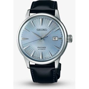 The Seiko Presage Cocktail Time is a line of watches inspired by Japanese cocktail culture and specific drinks from the Skybar in Tokyo's sophisticated Ginza area. The Skydiving cocktail is a delicate blue drink, and the dial of the watch reflects this colour with a beautiful sunburst pattern. The watch also features a vintage box-shaped Hardlex crystal and a constructed bracelet. The case back is exhibition, so you can see the intricate workings of the Japanese mechanical movement. • Powered by the automatic movement with 29 jewels and a power reserve of up to 41 hours. • Presented on a black leather strap with push button clasp. • Hardlex glass. • 40.5mm case width. • 50 metre water resistance.