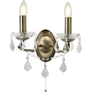 Specification Searchlight Paris - 2 Light Indoor Candle Wall Light Antique Brass, Clear with Crystal Glass, E14 Finish: Clear, Antique Brass Material: Metal, Glass IP Rating: IP20 Height (cm): 27 Width (cm): 32 Projection (cm): 22 No. of Lights: 2 Lamp Type: E14 LED Switched: Yes Wattage (max): 7 Description This exquisite wall bracket is comprised of two lights surrounded by intricate crystal detail for a truly dazzling effect. The main body of the light includes antique brass to add a stylish touch. The fitting is sure to add an elegant touch of class. The collection includes a choice of different sized chandeliers, and a matching wall light, all of which are available in more than one finish. Class one.