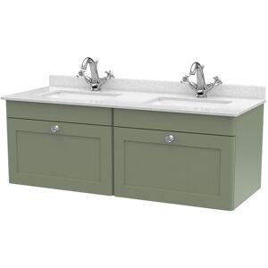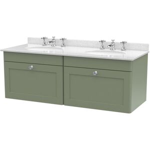 Model Number: CLC894GR6 Transform your bathroom into a stylish sanctuary with the Nuie Classique Satin Green 1200mm Wall Hung 2 Drawer Vanity Unit. This stunning vanity combines traditional elegance with contemporary functionality, featuring a rich satin green finish that adds a touch of sophistication to any space. Accompanied by a luxurious grey marble countertop and two round ceramic basins, this unit not only provides ample storage but also enhances your bathroom's aesthetic appeal. The six tap holes are conveniently positioned to accommodate a variety of mono basin mixer taps, making it easy to create your desired look. Designed with practicality in mind, this vanity unit includes two soft-close drawers, ensuring that you have sufficient space to store your bathroom essentials while maintaining a clutter-free environment. The polished chrome handles add a subtle yet stylish contrast to the satin green finish, completing the refined look of this exceptional piece. Key Features: