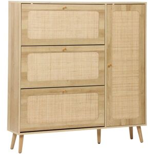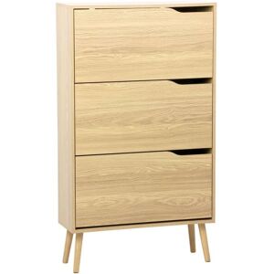Product benefits : - Capacity for 18 pairs of shoes - Ideal in a hallway - 3 doors / flaps You'll love the warm, unique charm of this shoe cabinet. With its walnut wood finish, its dark colour sets it apart from traditional light wood furniture. Its compass legs and sleek silhouette make it an ideal choice for a Scandinavian or vintage look. As well as being welcoming, this shoe cabinet is the ideal partner for adding a touch of functionality to your hallway. It features spacious compartments for up to 18 pairs of shoes. Hinged doors make it easy to view each pair, so you can make a quick choice when deciding what to wear becomes difficult. A practical solution for organising and optimising your space in the most efficient way possible! Material: Particleboard Colour: Walnut Number of doors: 3 Storage capacity: 18 pairs of shoes Compass legs: 4 Shoe cabinet: W 75 x D 26 x H 131cm Panel thickness: 1.5cm Doors / flaps : W 71.5 x H 35cm Leg height: 15cm Net weight: 27kg Maximum supported