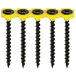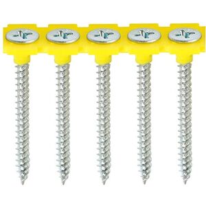 Used to secure plasterboard to timber stud work. The collated strips are specifically designed to be compatible with all leading power tool brands. NOTE: Partially threaded. Features The collated strips are specifically designed to be compatible with all leading power tool brands Specification Colour/Plating - Black Phosphate Recess Type - Phillips Head Type - Bugle Pack Type - Box Pack Quantity - 1000 Size - 3.5 x 25mm