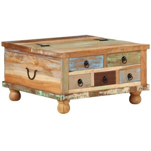 This industrial-style wooden coffee table exudes a vintage charm and will make a timeless addition to your home. The coffee table can also be used as a side table or end table. The retro coffee table is handmade of reclaimed wood which is stable, durable and beautiful, and has the characteristics of different woods like teak, mango wood, acacia, recycled wood, hard wood, etc. Every step of the process is carried out with the greatest care, be it polishing, painting or lacquering. The craftsmanship and the beautiful wood grains make every piece of furniture unique and slightly different from the next. In addition, the 5 drawers and the large interior compartment provide ample space for any items you'd like to keep within reach. Important note: The colours vary from piece to piece, making each of our tables unique. The delivery is random, ensuring the exclusivity and individuality of your product. Material: Reclaimed wood, MDF Dimensions: 70 x 70 x 38 cm (L x W x H) Polished, painted