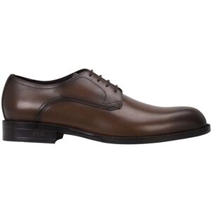 Featuring smooth leather uppers with intricate stitching, these BOSS Menswear Derby shoes are a refined formal touch. Durable heel with embossed logo. This product contains at least 60% better raw materials. We continuously look for more responsible ways to produce and finish our products. A minimum of 60% of the leather used to make this product has been sourced from certified tanneries. Features:- Sole: Other material- Lining: Fully lined- Fastening SLA: LacesSpecifications:- Material: Innersole: 5% Polyurethane, 95% Polyester, Lining: 5% Polyurethane, 95% Polyester, 50% Polyester, 50% Polyurethane, Quality: 100% Cow hide leather, Sole: 100% Thermoplastic polyurethane, Upper material: 100% Cow hide leather