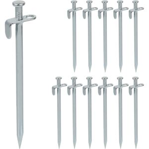 If you value reliable ground anchoring when camping on hard and stony surfaces, you should opt for rock pegs in a set of 24. The long ground anchors made from durable steel withstand wind and weather without bending. Thanks to their sharp tips, the pegs penetrate the ground easily. Cords from awnings or canopies can be attached to the hooks and the hole at the head of the anchors to ensure nothing loosens even in windy conditions. Details of the rock pegs set of 24 - Dimensions with head H x W x D: approx. 20 x 4 x 1.5 cm - Diameter of the rock peg: approx. 8.7 mm - Dimensions of head H x D: approx. 2.5 x 1.5 cm - Hook dimensions H x W: approx. 2 x 1.2 cm - Weight per peg: approx. 110 g - Material: stainless steel - Colour: silver Ground anchors with hooks and holes, set of 24 - For securing tents, awnings, pavilions, and more - Suitable for hard and stony ground - Withstands strong winds and storms - Hook and hole for cord attachment - Very sturdy steel – no bending Included in the