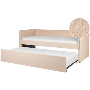 Upholstered Daybed with a Trundle. A trundle bed is a practical choice for bedrooms with limited space that still need to accommodate two people. It's especially useful for shared children bedrooms. Upholstered in elegant bouclé fabric that is adorned with decorative studs, this piece will seamlessly blend into modern and glamour bedrooms. The bed comes equipped with elastic wooden slats which provide stable body and mattress support. Details: Product Type: Daybed Style: Glam General Color: Pink Shade: Peach Pink Material Type: Fabric Main Material: Boucle Additional Material: Eucalyptus Wood Material Composition: 100% Polyester Fabric Upholstered Back: No Storage: No Dimensions: Headrest Dimensions: 99x84 Width: 99 cm Length: 213 cm Height: 84 cm Sleeping Surface: 90x200 cm Weight: 55 kg Weight Capacity: 150 kg Offer Includes: 1 x Bed Frame, 2 x Slatted Frame (12 Sprung Slats), Not Included: Mattress, Bedding and Cushions Key Features: Second Hidden Bed to Use when Needed, Very