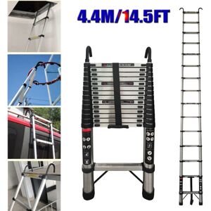 About this item: SAFE AND RELIABLE: Made of high quality stainless steel, 14 safe steps, each step has 2 individual locking knobs to prevent bumping and falling. 150kg maximum load capacity and EN131 certified Telescopic design: height adjustable from 93 cm to 4.4 m, convenient for many tasks and easy to carry; Non-slip construction: two hooks at the top of the telescopic ladder ensure a firm grip on the wall, and high-quality non-slip rubber feet that allow the ladder to be easily attached to the wall and floor. Each pedal is striped for increased friction; Easy to store and portable: lightweight and compact, net weight approx. 13.8 kg, easy to carry and store; a locking strap secures the ladder firmly and is easy to carry; Multipurpose: perfect for working indoors and outdoors, e.g. Maintenance of home and buildings, window cleaning, indoor/outdoor decoration, painting and more. Telescopic extension ladders provide enough safety and convenience in climbing. Going from a compact 93cm