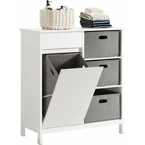 Modern design laundry cabinet storage cabinet would be suitable for a variety of locations, like bathroom, laundry room, utility room, etc. It features a cupboard with concealed laundry basket making it a practical addition to any bathroom. The drawer and 3 fabric baskets provide ample storage space for your bathroom essentials. The laundry basket and 3 fabric baskets can be taken out completely as a great storage solution. The top of the cabinet is ideal for storing something you might need in reach, or some items you want to display. Coming with silicone feet covers, not only protecting this cabinet from moisture in the bathroom, but also effectively protecting your floor from scratching. Coming with anti-tipping device, ensuring great stability and safety. Space saving storage solution that will help keep your bathroom tidy and organized. Fashionable appearance, so it sure fit perfectly with any style of decor. Product Details Material: MDF. Dimensions: W80 x D38 x H91cm. Weight: