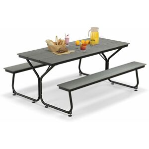 Enjoy Your Outdoor Dining Time with Your Family & Friends! Our outdoor picnic table set is designed with a large picnic table (loads up to 160 kg) and 2 benches(each bench loads up to 500 kg), and each bench can hold up to 3-4 people. In contrast to other wooden table that is -susceptible to corrosion and metal table that is susceptible to rust, our HDPE tabletop is dirt-resistant, waterproof, and sun-protection, lasting for years to come. More than that, the heavy-duty metal frame is constructed of 4 cm thickened metal tubes and adopts reinforced connections, ensuring good sturdiness. And there exist 8 large adjustable footpads on the bottom, helping keep it stable even on uneven grounds. In addition, the dining table is designed with a built-in umbrella hole (diameter: 5.8 cm), bringing convenience for inserting an outdoor umbrella and enjoying a shady outdoor area. With its exquisite craftsmanship and sleek lines, this stylish picnic table can also be a highlight to any indoor or