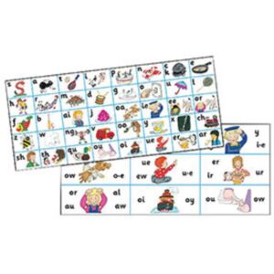 A pack of two full colour posters, the Letter Sound Wall Charts attractively display all of the 42 letter sounds. Each letter sound has an illustration that prompts the Jolly Phonics action and the sound.The bottom of the second poster displays the alphabet, which is colour coded to match the Jolly Dictionary. Each poster opens out to be 84cm/33” wide x 59cm/23” high.