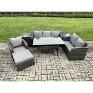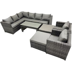This Modern deluxe rattan garden furniture is best for multiple occasion. The Rattan set is strong durability which lasts for a long time, it also has strong tempered table top glass. Cushions are included and are fitted to the shape of the sofa and chairs for comfort. This wonderful product will help you showcase any garden, patio or conservatory. Set Dimensions: 1 x Sofa with double armrest: 177W x 65D x 66H cm 1 x Arm chairs size: 74L x 65W x 66H CM 1 x Side coffee table 65L x 65W x 66H cm 1 x Big footstool 65L x 65W x 34H cm 2 x Fully Assembled Stools :40W x 40D x 34H cm 1 x Rectangular Table: 85L x 50W x 37H cm High-quality Materials: Our rattan garden furniture set is made with light grey mixed rattan and dark grey fabric, ensuring durability and a stylish look. Please note that the color may vary slightly due to lighting or monitor settings. Easy Assembly: The items come flat-packed, requiring self-assembly. Rest assured, our sturdy galvanized steel tube metal frames with powder coating prevent rust, guaranteeing a long-lasting product. Low Maintenance: Our furniture set features removable cushion covers for easy cleaning. We recommend keeping the cushions indoors or using a rain cover when not in use. Additionally, covering the furniture with a rain cover during extended periods of non-use will help maintain its quality. Handmade Craftsmanship: The flat PE rattan used in our furniture set is completely handmade, adding an artisan touch to your outdoor space. The 5mm thickness clear tempered glass with a sucker on the surface prevents sliding, ensuring stability and safety. Ultimate Comfort: With 8cm thick seat cushions and soft pillow back cushions, our rattan garden furniture set offers exceptional comfort for lounging outdoors. Enjoy relaxation at its finest with our high-quality seating option. Factory Directly Sold To Guarantee The Quality And After Sale Service Important notice: pls check the product carefully before signing it .if it arrive with any obvious damage ,pls kindly mark on the receipt .we will file claim to the courier and send the replacement .thank you This item is for kerbeside delivery , we can't deliver to your room . WARRANTY&SUPPORT:Though we have nearly 100% checking before shipment but as this item is 100% by handmade so If you have any issues of assembly, missing parts, damaged or other problems of product quality of this outdoor rattan furniture set, please feel free to contact us, and our after-sales team will respond within 24 hours and offer you the most perfect and powerful solutions Fimous 7 Pieces Rattan Garden Furniture Set Outdoor Garden Sofa Chair Coffee Table Set with Side Table 3 Footstools Light Grey Mixed