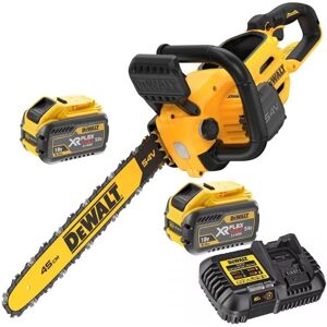 The DEWALT DCMCS574 XR FlexVolt Chainsaw is supplied with: 2 x 18/54V 9.0/3.0Ah FlexVolt Li-ion Batteries 1 x Charger The DEWALT DCMCS574 XR FlexVolt Chainsaw has an energy efficient brushless motor for longer run time. Being battery powered, it requires less maintenance than a petrol chainsaw, and has an auto-oiling system that keeps the chain lubricated. It also has a tooled chain tensioning system built to professional specifications, this helps to ensure that the chain remains reliably tensioned during use. The chain speed has been optimised for improved torque and a chain brake stops the chain in less than one second if triggered.