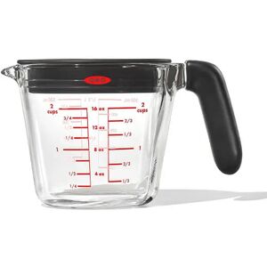 The OXO Good Grips 500ml Glass Measuring Cup With Lid is perfect for the avid chef or baker, ideal for both wet and dry ingredients. It has an ergonomic handle for a comfortable grip, and a see-through glass jug for easy reading. It displays measurements in both millilitres and cups, and has a pouring spout for accurate decantering. Dimensions: 9.1 (H) x 17.7 (W) cm. Capacity: 500ml, 2 cups. Made from glass with silicone handle and lid. Microwave and freezer safe. Dishwasher safe.