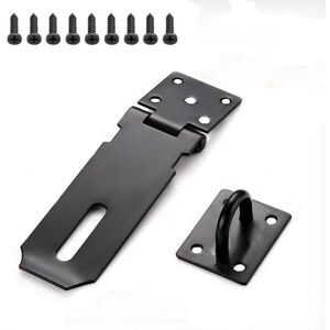 Update your door hardware with the Latch. Heavy Duty Security Door Lock Latch - 4 inch. Available for garden door, back door, fence door, garage door, barn door. Perfect for closets or small shelters or pet cages, cages. Prevents people from gaining access to a filing cabinet in an office. Key Features: - Heavy duty door latch with concealed fixings to ensure added security and long lasting performance. - Flexible hasp with smooth locking that allows you to open and close the latch easily. - Latch and clip with high quality mounting hardware suitable for 180 degree and 90 degree installation. - Folding gate lock perfect for a variety of doors, cabinets, windows, drawers, lockers, pet gates, tool boxes and much more. Features: Material: metal. Finish: plating. Color: black. Dimensions: 105 x 40 mm. Thickness: 2mm. Mounting hole diameter: 5mm. Suitable for padlocks with a diameter (max.): 19 mm. Weight: 114g. Contents: 1 hasp and staple. 9 screws.