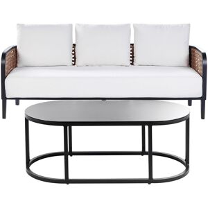 Outdoor Metal Sofa and Coffee Table Set. Elevate your garden's style and transform it into a meeting space with this furniture set. The sofa and table frames are made from durable, high-quality aluminium in a black finish, which makes them rust-resistant. What is more, the couch's backrest is adorned with attention-drawing Viennese braid, made out of PE rattan. The set also comes with thickly padded cushions in an off-white colour, crafted out of water-repellent fabric, which makes them perfect for outdoor use. The modern look of all pieces will allow you to match them with various contemporary outdoor spaces. Details: Product Type: Garden Sofa Style: Boho General Color: White, Black Shade: Off-White Material Type: Metal Main Material: Aluminium Additional Material: Fabric Material Composition: 100% Polyester Seat Foam Density: 28 kg/m3 Seats Up To: 3 People Dimensions: Armrests Height: 65 cm Depth: 74 cm Seat Thickness: 21 cm Seat Height: 41 cm Width: 200 cm Height: 87 cm Seating