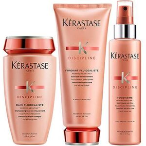 Kérastase Discipline Fluidealiste Duo - Normal/Sensitised Hair contains: 1 x Kérastase Discipline Bain Fluidealiste 250ml 1 x Kérastase Discipline Fondant Fluidealiste 200ml Kérastase Discipline is designed to smooth and control flyaway, frizzy hair. Providing 72 hours of frizz control and humidity protection whilst reducing blow-dry time, achieve manageable, elegant and free-flowing hair with the latest technological innovation from French hair specialists Kérastase.Enriched with a Morpho-Keratin Complex™ that contains amino acids, wheat protein and Ceramide-R, it works to restore the hair’s fibre, making hair smoother from root to tip, with a healthy-looking shine. Kérastase Bain Fluidealiste Smooth-in-Motion Shampoo cleanses and nourishes hair to leave hair light, smooth and soft. Kérastase Fondant Fluidealiste is a conditioner for normal to sensitised hair, working to strengthen and nourish whilst leaving hair with a light touch. Discipline Bain Fludealiste 250ml Morpho-Keratine technology restores inner flexibility and weightlessly disciplines he fibre for perfect hair movement. Taming frizz and protecting against humidity. With a surface protector to make the hair smooth, soft and east to detangle. High precision care agent for restoration with a natural, weightless effect. Discipline Fondant Fluidealiste 200ml Morpho-Keratine technology restores inner flexibility and weightlessly disciplines he fibre for perfect hair movement. Taming frizz and protecting against humidity. Softening agents to make hair soft to the touch. Lipid Agents to smooth the hair and provide frizz protection.