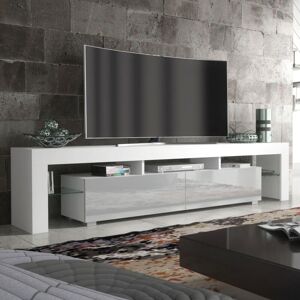 The Nova TV Unit transforms your living room into a spacious and elegant entertainment hub, serving as a stunning centerpiece for any contemporary interior. Measuring 200cm (W) x 45cm (H) x 35cm (D), this generously sized cabinet combines style and functionality, making it the perfect fit for larger spaces. The unit features a sleek matte body paired with high-gloss doors, creating a clean and modern aesthetic. Two glass shelves on either side provide an ideal display area for decor or media accessories, while three central open compartments ensure easy access to your devices and other essentials. For hidden storage, the Nova TV Unit includes two push-to-open high-gloss doors, offering a discreet solution for keeping your living area organized and clutter-free. Please note: the Dark Oak with Black version features matte black doors, providing a unique and understated alternative to the glossy finishes available in other combinations. Crafted from durable 16mm chipboard and MDF, the