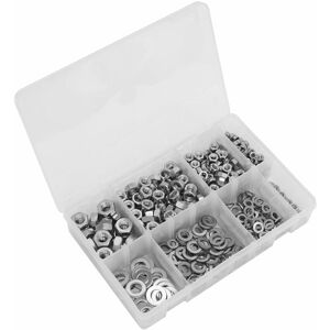 Stainless steel nut and washer assortment. Hex nuts to DIN 934. Form A flat washers to DIN 125. STAINLESS STEEL - A2 Stainless steel is resistant to corrosion, making it perfect for use on cars, bikes and construction. HIGH QUALITY - Grade A2 Stainless steel washers manufactured to DIN 125 and hex nuts to DIN 934. RANGE OF SIZES - Approximate Quantity: Nuts; M5 (x50), M6 (x100), M8 (x75), M10 (x25), Flat Washers Form A; M5 (x50), M6 (x100), M8 (x75), M10 (x25). PARTITIONED BOX - Keeps setscrews organised in their own compartment.