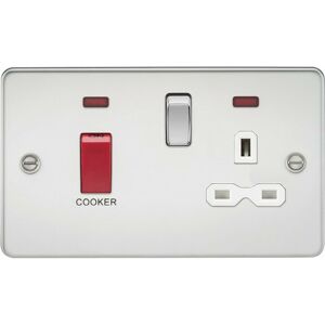 Specification Knightsbridge Flat plate 45A DP switch and 13A switched socket with neon - polished chrome with white insert Finish: Polished Chrome Material: Premium Grade Steel IP Rating: IP20 Height (cm): 8.75 Width (cm): 14.75 Projection (cm): 0.25 Weight (kg): 0.376 Description Cooker control units enable isolation of the unit so that maintenance and repairs to be carried out separately. The unit can be switched off, preventing the appliance from being turned on accidentally - for example whilst cleaning. Control two or more cooking appliances in the same room, providing rating is sufficient. This model combines a 45A switch with a 13A socket. Flat Plate low profile design. - 45A - Double pole - With neon indicators - 13A switched socket - Ultralow profile design with built in gasket - Certified to BS 4177, BS 1363-2 - Minimum mounting box depth: 47mm
