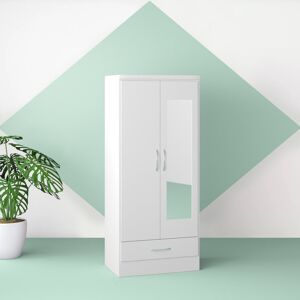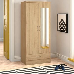 Contemporary and understated, this two-door wardrobe offers space for clothing but won't overpower your existing décor. It includes a hanging rail, one drawer, and a full-length mirror on the front of one of the doors. It is made from manufactured wood and has a metallic drawer and door handles. Assembly is required. Zipcode Design Finish: Grey Gloss/Light Oak Effect Veneer