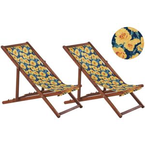 2 Folding Sun Loungers with 2 Replacement Fabrics. This multifunctional deck chair set in a classic design is the perfect accessory for the summer. With its foldable construction, it is easily moveable so that you can catch some sun rays in your garden or take it with you to the beach. Each reclining backrest is adjustable in three positions for utter comfort and convenience. Suspended on a sturdy, acacia wood frame, the sling features durable fabric in solid colour and a soft head cushion. Thanks to two replacement fabrics with a trendy pattern, you can change the sun loungers' look and add colours to your outdoor space. Details: Product Type: Sun Lounger Style: Scandinavian General Color: Brown, Multicolour, Grey Shade: Dark Grey Material Type: Wood Main Material: Fabric Material Composition: 100% Polyester Adjustable Backrest: No Adjustable Parts: Backrest Armrests: No Finish: Oiled Foldable: No Dimensions: Depth: 97/99/101 cm Seat Height: 28 cm Width: 54 cm Height: 70/76/84 cm
