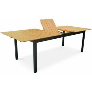 Large rectangular table in exotic wood and aluminium, including a large 50cm butterfly extension. The dimensions of the table vary from 2m to 2.5m long. Once extended, the table can accommodate a parasol in its centre, 50mm diameter or less. Eucalyptus is a hard wood, resistant to outdoor use, and we chose Eucalyptus from-certified forests in Uruguay. The wood is already coated with a tinted oil, to protect the furniture for outdoor use. The aluminium gives your garden furniture a guarantee of longevity; this material does not rust with rain or dew. The mix of wood and aluminium gives the table a contemporary and beautiful design. Key features: - Extendible table with place for parasol - Wood from certified forests, already oiled - Aluminium frame Wood colour: Natural, oiled. Aluminium colour: Black Dimensions : Table : L200/250 x D100 x H76cm Please be aware that we are unable to ship to the following postcodes: AB, BT, DD, DG, EH, G, GY, HS, IM, IV, FK, JE, KA, KW, KY, PA, PH,