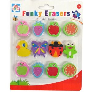 Funky Shaped Coloured Eraser Pack Of 12 By Kids Create Perfect Size For Kids Funky Shaped Coloured Eraser Pack Pack of 12, by Kids Create Fun pack of shaped erasers by Kids Create. Comes in a pack of 12. Shaped, illustrated and coloured as different characters as shown in the picture. These erasers measure 30mm x 25mm. Perfect size to fit in a pencil case. Not suitable for children under 3 years.