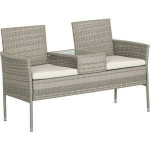 This Outsunny double rattan wicker chair combines two chairs and a coffee table into a single unit a place to sit and relax outdoors with your favourite person. Look to the middle table for a handy holding place, complete with a sleek tempered glass top. Specifications: ● Colour: Mixed Grey, Cream White ● Material: PE Rattan, Steel, Glass, Polyester ● Overall Dimension: 137W x 59D x 82H cm ● Seat Size: 45W x 47D x 42H cm ● Back Size: 45W x 44H cm ● Tabletop Size: 25.5W x 45.5D cm ● Bottom Shelf Size: 30W x 45D x 15H cm ● Weight Capacity (Per Seat ): 120 kg ● Item Label: 867-181V70GG Features: ● Combines two chairs and middle table ● Steel frame wrapped in stylish rattan ● Tempered glass-top table, with bottom shelf ● Cushions for comfort, with removable and washable covers ● Assembly required