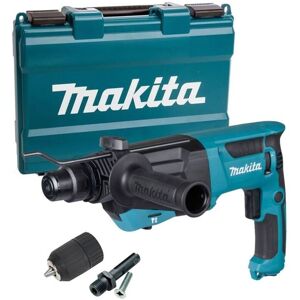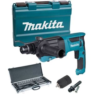 Comes complete with keyless SDS chuck and adapter with 10 piece SDS set in aluminium case. The Makita HR2670 26mm SDS+ Rotary Hammer is a powerful 800W tool designed for heavy-duty drilling tasks. It features a recessed lock-on button for continuous use, a built-in LED job light, and compatibility with Makita vacuum cleaners. The hammer offers variable speeds up to 1500 rpm and impacts up to 4500 bpm, with a maximum drilling capacity of 26mm in concrete. It has an impact energy of 3.0 J and is adapted for SDS-PLUS bits. The tool weighs 2.8 kg, includes a 4m power supply cord, and comes with a depth gauge for precise drilling. Replaces the HR2630 SDS HR2670 Features: Powerful 800 W motor delivers 3.0 J of impact energy to handle the most demanding applications A powerful impact energy of 3.0 Joules Variable speed controlled by trigger Reverse Switch and Lock on button 3 modes Rotation only, Hammer only and Rotation + hammer action 4 Metre power cord Recessed lock-on button for