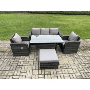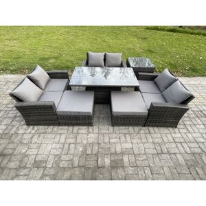 Set Dimensions: 3 x Sofa with double armrest: 177W x 65D x 66H cm; 1 x PC Rising dining table: 140L x 80W x 68/48H cm (height up 68, down 48); 2 x Big footstool 65L x 65W x 34H cm; 2 x Side coffee table 65L x 65W x 66H cm; Dark grey mixed rattan with dark grey fabric .Color may some difference due to light or monitor .we are unable to return the item due to color problem. the product is delivered on pallet, to kerbside only. Fimous Wicker PE Rattan Garden Furniture Sofa Set Outdoor Adjustable Rising Lifting Dining Table Set 11 Seater in Dark Grey