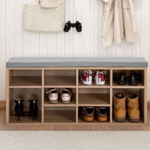 Product Features Only the 24cm deep Dimensions: W45x D30 x H104 cm Weight: 19.7kg The load capacity: approx. 150kg Color: Oak / White Thickness of cushion: 3cm Material: High quality chipboard, which meets the E1 degree standard Description Feature: Variable: You decide on the height of the compartments, such as for boots or handbags. Click system: The boards are not just placed on metal pins, but are accurately clicked into place. This will prevent them from falling out, and they will not move when the compartments are overfilled. Feet: Almost invisible 3 mm-high feet provide protection against moisture, for example when mopping the floor. Groove system: The rear wall is not affixed with nails as per usual, but comfortably disappears into a groove, and is then affixed with back wall stabilisers. This provides extreme stability and strength. Removable seat cushion Delivery -1x shoe cabinet -1x screw set -1x assembly instructions Note: Thanks for you buying our product, if you have any