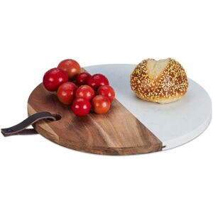Are you looking for a cutting board that is not only functional but also looks good? Then look no further. A stylish mix of acacia wood and white marble, this chopping board is perfect for cutting fruit, vegetables, fish and meat. It can also be used as a serving board or cheese board. The breakfast board can be hung up by the loop for space-saving storage. The natural materials are robust and won't impart taste in your food. Chopping Board in Detail - Dimensions H x D: approx. 1.5 x 25 cm - Length of loop: approx. 7.5 cm - Weight: approx. 1 kg - Material: Acacia wood, marble - Colour: Natural, white Round Serving Board to Hang Up - For cutting ingredients, arranging and serving - Loop for hanging and space-saving storage - Round breakfast board with wood and marble design - Ideal for fruit, vegetables, fish and meat - The natural materials are robust and durable - Simply clean the kitchen board by hand after use Scope of Delivery - 1x cutting board - Decorative items are not included