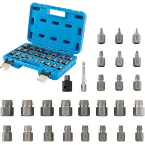 The screw extractor set includes 2 adapters and 25 extractors, ranging from 1/8" to 7/8" in 1/32" increments, all stored in a HDPE case. This versatile kit, engineered for the effortless removal of stripped, frozen, and damaged screws, is particularly beneficial in applications such as automobile repair, house renovation, and machinery installation. The innovative 3/8" square drive design offers flexible connection options, simplifying its use with a ratchet wrench. The multi-spline design, coupled with a reversed spiral, maximizes grip while minimizing user effort. Constructed from heat-treated Cr-Mo steel, this set is built to endure harsh use and withstand tough conditions. Upgraded Connection: This dual-headed screw extractor kit features a standard 3/8” square drive for compatibility. It differs from traditional screw extractors by allowing direct attachment to a wrench, eliminating the need for intermediary connecting sleeves. Wide Applications: The 27 pcs screw removal kit