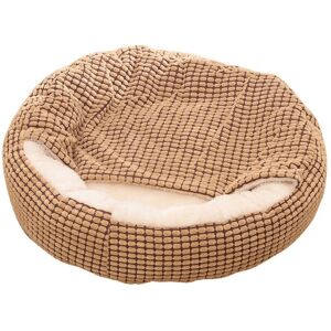 BEST CHOICE FOR YOUR PET LOVER: The 2 in 1 covered pet bed comes with an attached donut-shaped blanket hood, providing an ultra comfortable, warm and safe insulating burrowing nest for your dogs and, for calming, anti-anxiety, better sleep, better health ULTRA SOFT MATERIAL SAFETY: The inner sleeping pad is covered with ultra soft corn velvet, deep filling high resilience pp cotton. And the outer features corn kernel-shaped brown plush fabric, it looks cute and fashionable. a to the nose, good protection for paws. It will be comfortable for your pet sleeping and resting. Suitable for all seasons for your pet on dog bed. NON-SLIP BASE: For your pet's safety, the dog bed is equipped with anti-slip dots for the bottom to prevent it from moving on a non-carpeted place. also a little waterproof. When the bottom is a little wet, you can dry it with a towel SIZE: 19.6 inch pet bed recommended for small dogs/ any age no more than 6.6 lbs. Please measure your pet's size and weight before