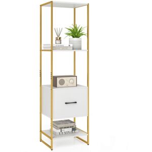 Its sturdy metal frame can hold up to 60 kg. The reliable design comes equipped with dual anti-tipping features and adjustable foot pads for stability on any surface. Perfect for maximizing space, the slim and tall configuration fits seamlessly into smaller areas. Enjoy premium touches like a 11 cm elevated base for easy cleaning access and metal slides for smooth drawer operation. 5-Tier Storage Solution: The 5-tier bookshelf offers expansive space across multiple shelves and is ideal for organizing everything from books to decorative items. Besides, the bookcase comes with an added drawer to further ensure discreet storage. Robust Metal Structure: The shelving storage organizer boasts a solid metal frame that supports up to 60 kg of weight. Not only does it offer optimal durability against everyday use, but it also ensures your items are securely displayed. Enhanced Stability Features: Designed with your safety in mind, the freestanding display shelf unit is equipped with dual