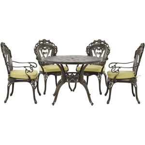 Retro Outdoor Dining Set for 4 with Parasol. Elevate the decor of your outdoor area with this vintage-inspired dining set. Light yet durable thanks to aluminium construction, the set includes a round table and four chairs. It boasts beautiful, curvaceous lines, intricate patterns and brown finish that give it a unique, sophisticated look. The set comes with four seat pads filled with lightweight foam for utter comfort. With 16 options available, you can choose a parasol that will best complement your outdoor space style. Details: Product Type: Dining Set Style: Retro General Color: Brown, Green, Beige Shade: Dark Brown Material Type: Metal Main Material: Aluminium Additional Material: Fabric Top Material: Metal Material Composition: 100% Polyester Finish: Polished Seat Foam Density: 28 kg/m3 Seats Up To: 4 People Dimensions: Chair Dimensions: 58x97x69 cm Seat Thickness: 5 cm Seat Height: 41 cm Table Dimensions: 100x72x100 cm Umbrella Dimensions: 270x270x230 Overall Dimensions: