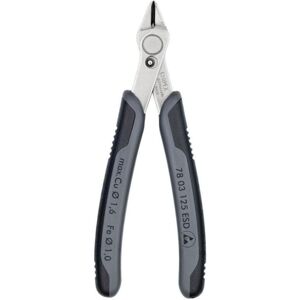 78 03 125 ESD Electronic Super Knips® ESD Precision pliers for ultra fine cutting work, e. g. in electronics and fine mechanics. Electrically discharging handles - dissipative. Ground, very sharp cutting edges without bevel. Shear cut with controlled micro cutting edge misalignment for the most precise cutting of even the thinnest of wires and for a long service life. Precisely shaped tips cut wires close to a surface from Ø 0.2 mm. Joint with stainless steel rivet. Extremely smooth movement for minimum operator fatigue. With opening spring and opening limiter. cutting edge hardness approx. 54 HRC. INOX tool steel. - Cutting capacities medium hard wire (diameter): Ø 1.0mm- Cutting capacities soft wire (diameter): Ø 0.2 – 1.6mm- Jaw length (B): 9mm- Jaw thickness (joint) (D): 7.5mm- Head width (A): 13.5mm- ESD: yes