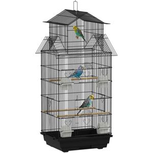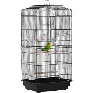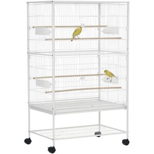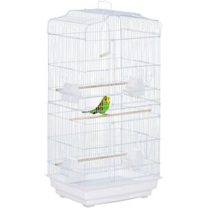 A place for birds to thrive, thanks to this spacious cage from PawHut. It comes with four wooden perches, providing plenty of options for pets to stand, whilst the four plastic containers are for easy feeding. There are two large front doors and four side doors, so you can access the cage, ensuring they have enough food and water. The bottom pull-out tray makes for effortless cleaning, keeping their cage hygienic. Finished with four wheels – you can roll the cage to any area with minimum fuss. Specifications: ● Colour: White ● Material: Steel and wood ● Dimensions: 132H x 78L x 52Wcm. Bird cage: 95H x 78L x 52Wcm. Front door: 24.5L x 21Wcm. Side door: 10.2L x 10Wcm. Bottom tray: 3H x 74L x 50Wcm ● Bar Spacing: 1.5cm ● Weight capacity (bottom shelf): 10kg ● Item label: D10-075WT Features: ● Multiple doors for easy access ● Includes four wooden perches and four plastic food containers ● A bottom slide-out tray for easy cleaning ● Four universal wheels for easy movement ● Use the bottom