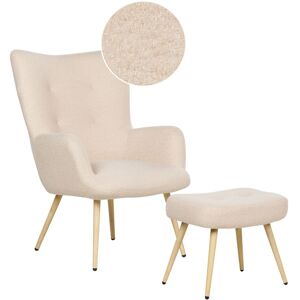 Mid-Century Modern Armchair with Ottoman. This exceptionally comfortable set comprising of an armchair and an ottoman in a stylish design is set to become an excellent addition to your living room, matching any contemporary or traditional decor. The high-quality boucle fabric is extra sturdy, retaining its look even after prolonged usage. The wide upholstered seat with button decoration and high back and armrests ensure complete seating comfort. The ottoman works best as a footrest, enhancing seating comfort even further. Angled rubberwood legs give the set great stability and longevity. Details: Product Type: Armchair Style: Retro General Color: Green, Brown Shade: Light Green Material Type: Fabric Main Material: Boucle Additional Material: Metal Filling Material: Foam Legs material: Wood Seat Material: Fabric Material Composition: 100% Polyester Arm Style: Recessed Armrests: Yes Footrest: No Leg Caps/ Pads: Yes Pattern: Solid Reclining: No Seat Construction: Metal Seat Foam Density: