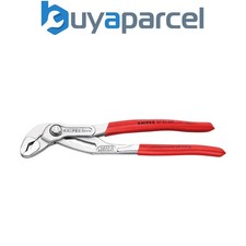 87 03 250 SB KNIPEX Cobra Push the button for adjustment on the workpiece. Fine adjustment for optimum adaptation to different sizes of workpieces and a comfortable handle width. Self-locking on pipes and nuts: no slipping on the workpiece and low handforce required. Gripping surfaces with special hardened teeth, teeth hardness approx. 61 HRC: high wear resistance and stable gripping. Box-joint design for high stability due to double guide. Reliable catching of the hinge bolt: no unintentional shifting. Pinch guard prevents operators' fingers being pinched. - Adjustment positions: 25- Kapazität für Rohre (Zoll): 8960; 2 in- Capacities for nuts: 46mm- Capacities for pipes (diameter): 8960; 50mm