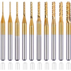 【Practical】10 different sizes end mill sets to meet your different application needs. 【Durable】Engraving cutter made of tungsten steel alloy, titanium plated surface, high hardness, wear resistance. 【High Efficiency】Sharp cutter edge, good cutting performance; Helical groove, prevent chip accumulation. 【Universal Tool】1/8 inch (3.175 mm) shank carbide end mill, suitable for desktop CNC machines, engraving machines, etc. 【Widely Application】End milling cutter set is suitable for processing MDF, PVC, SMT, CNC, PCB printed circuit board, soft metal, plastic, wood, etc. Features Size: 0.8, 1.0, 1.2, 1.5, 1.6, 1.8, 2.0, 2.4, 3.0, 3.175 mm Shank Diameter: 3.175 mm (1/8 inch) Cutting Length of End Mill: 12 mm Total ... cutter: 38mm Material: Tungsten Carbide Coating: Titanium Warm Tips 1. Please pay attention to the cutting parameters when using to avoid the drill bit being broken due to improper use. 2. Please allow slight errors in the size and color of the product due to the difference