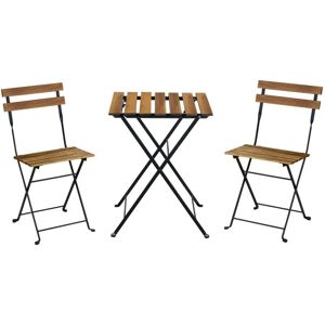 A charming bistro-style garden table set Inspired by cafe terrace furniture, this set will be your favorite companion for summer meals. It consists of a table and 2 chairs, perfect for a cozy meal for two, enjoying a cup of coffee, or for a relaxing aperitif. With its small size, this garden table is perfect for small terraces or balconies. A clever and durable set Malagua is designed with high-quality materials. Acacia wood is known for its durability and resistance. Its steel structure is coated with black epoxy paint, making it resistant to wear and tear. Perfect for outdoor use! The advantage of this bistro set? The chairs fold for easy storage, allowing you to save space. A smart choice when you have limited space! Color: Black Material: Acacia wood Structure Material: Steel treated with epoxy paint Assembly: The product is delivered fully assembled, in its original packaging Number of seats: 2 Table: L 55 x W 54 x H 71cm 2x Unfolded Chair: L 44.5 x W 39 x H 79cm Backrest